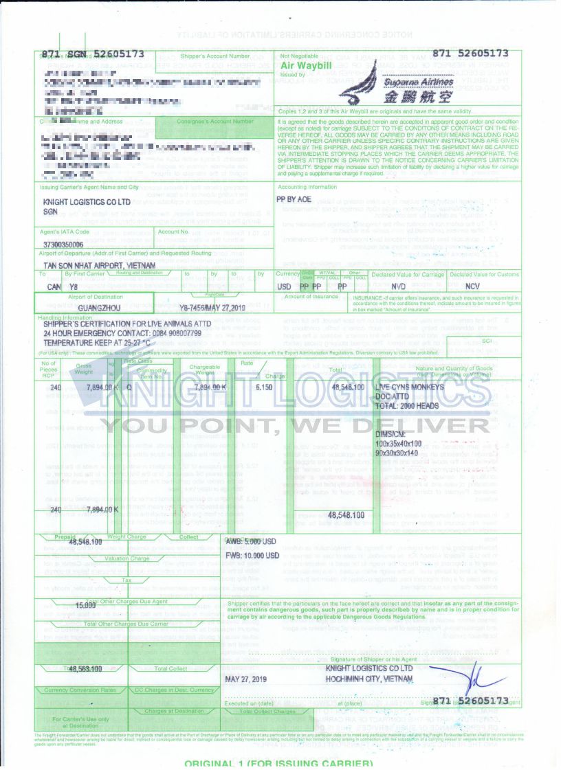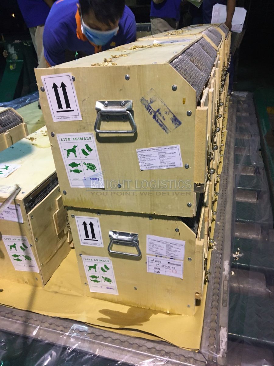 In this project, Knight Logistics arranged the export of 2,000 long-tailed macaques (Macaca fascicularis) on a dedicated charter operated by Suparna Airlines, flight Y8-7456, departing from Tan Son Nhat International Airport and arriving at Guangzhou Baiyun International Airport. The shipment was received at the SCSC cargo terminal and ground-handled by SAGS. To keep incidental costs to a minimum, the entire operation had to be film organized in advance and executed swiftly, accurately, and safely.
